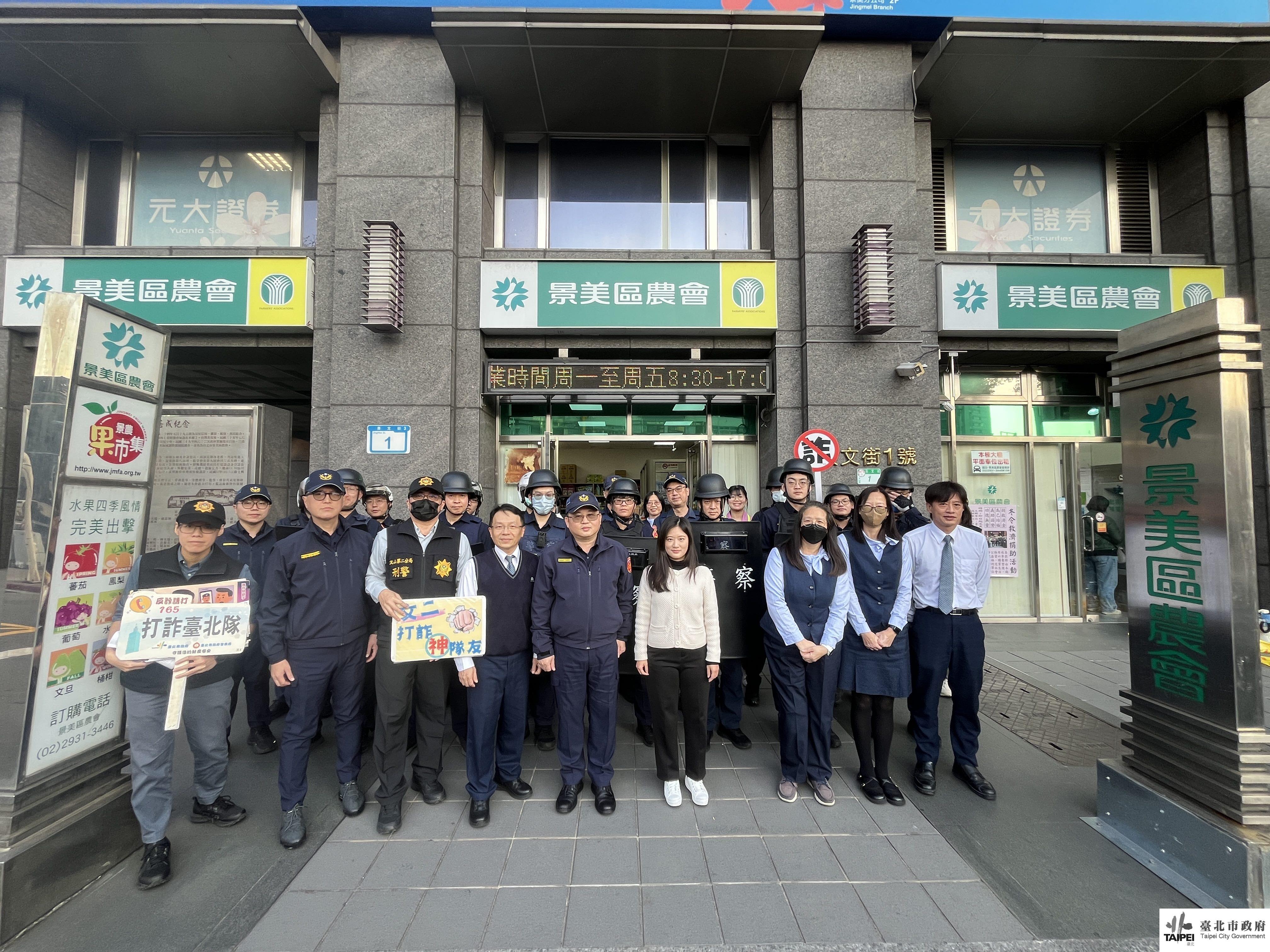 農曆春節將至,文山區民眾提領現金與資金往來進入高峰期,為防範歹徒覬覦金融機構財物,臺北市政府警察局文山第二分局於昨(15)日下午16時,於景美區農會舉辦「防搶演練暨快速打擊犯罪部隊」實兵演習,現場模擬歹徒持槍挾持人質的緊繃情境,隨後由警方啟動快速打擊犯罪部隊後迅速制伏歹徒,展現警方快速機動反應與危機處理能力。 本次演練模擬民眾因誤信「假投資」詐騙,前往景美農會欲辦理臨櫃提款以面交予詐騙集團車手,正當行員察覺異樣進行關懷提問時,歹徒突然持槍闖入,並高喊「搶劫」威嚇行員交出現金,更一度脅持該名女子作為人質與警方對峙,所幸行員機警假意配合歹徒,並立即觸動警報器通報警方,文山第二分局接獲警報後,立即啟動「快速打擊犯罪部隊」,立即由派出所、交通分隊、警備隊等組成優勢警力迅速趕抵現場,並由談判官採取溫情攻勢,以「老母親等吃年夜飯」等話語勸降,成功引開歹徒注意力並救出人質,隨後在攔截圍捕警力配合下,於景華公園將逃逸歹徒一舉逮捕,完美落幕達成演練目標。 文山第二分局春節不打烊,在民眾歡度佳節的同時,亦將持續於人潮聚集場合宣導防竊、防搶、防詐騙等觀念,積極防範強盜、搶奪及詐騙案件,並呼籲民眾如欲領用大量現金,請儘量使用臨櫃轉帳方式或由親友、同事陪同下提領取,以便相互照應,並可隨時向警察機關申請警力護鈔以確保人身及財物之安全。
